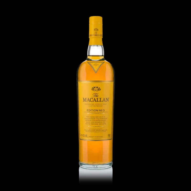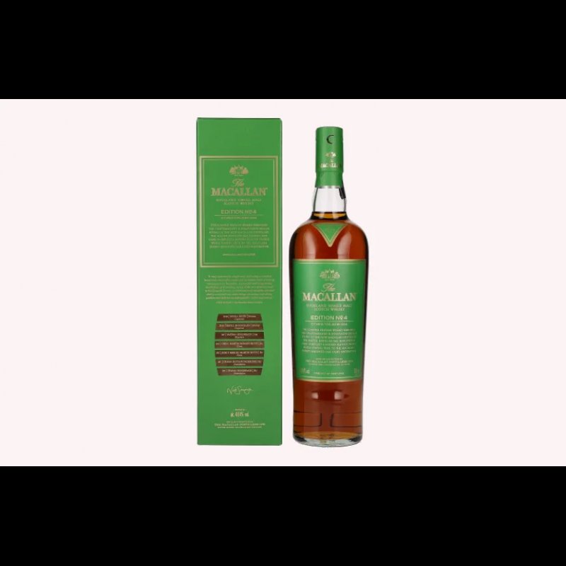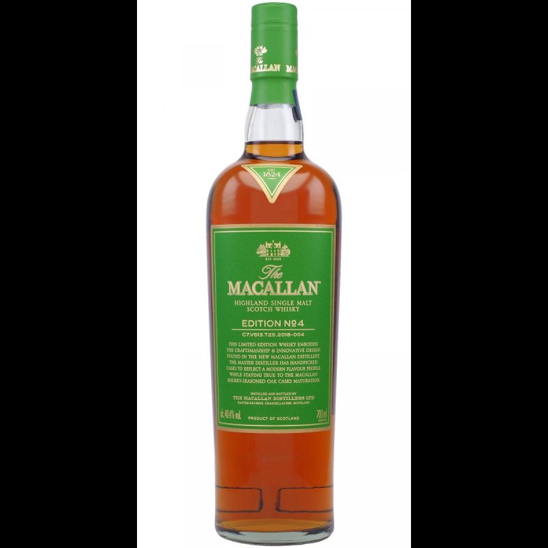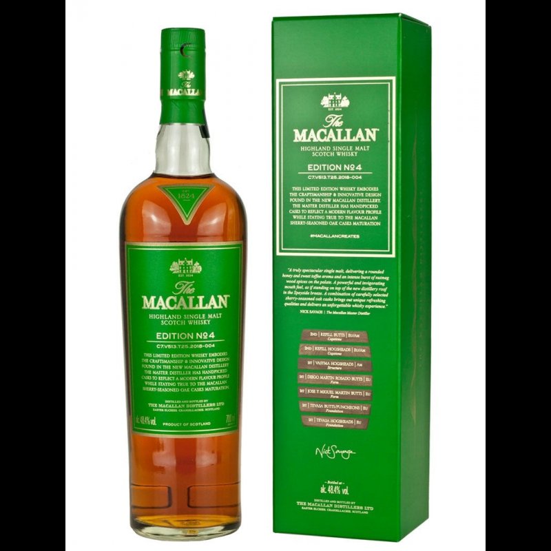 Macallan Edition No. 4. The fourth entry in the Edition range (2018), this release focuses on the structure of the distillery's trademark weighty style, as well as celebrating the opening of Macallan's incredible new distillery. It is a well-balanced dram, constructed to show the best of each cask type selected to create the whisky: European and American oak refill butts and hogsheads, as well as butts, puncheons and hogsheads specifically from Vasmya, Diego Martin, Jose y Miguel Martin and Tevasa.